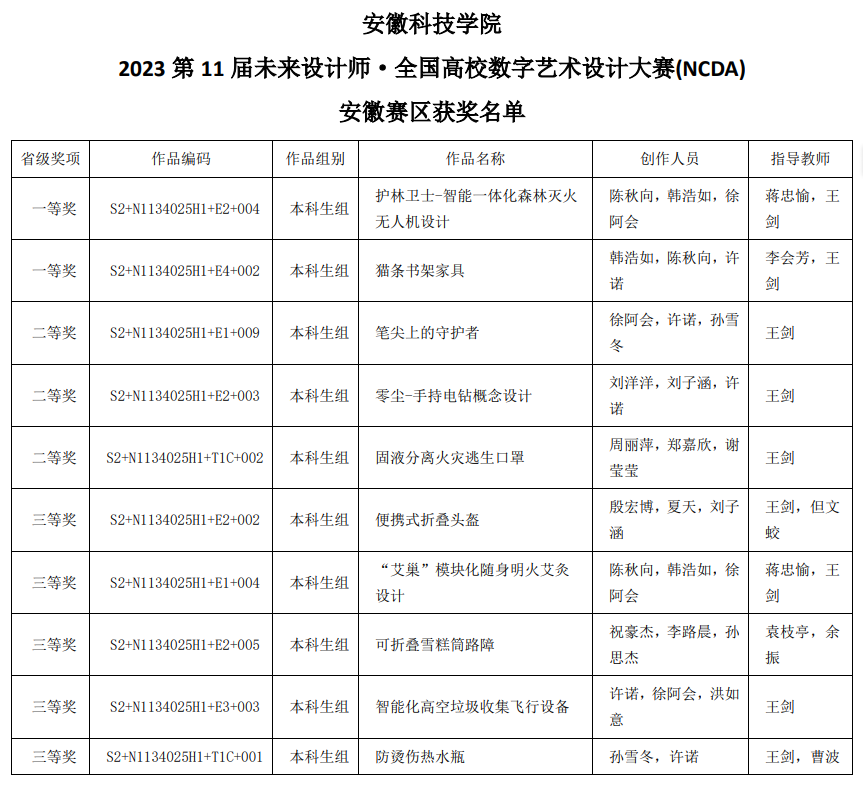 8月15日,第11届未来设计师·全国高校数字艺术设计大赛(NCDA)省级赛获奖作品公布。经过烈竞争和评委们多轮评审,我校机械工程学院工业设计专业学子荣获安徽赛区一等奖2项、二等奖3项、三等奖5项。