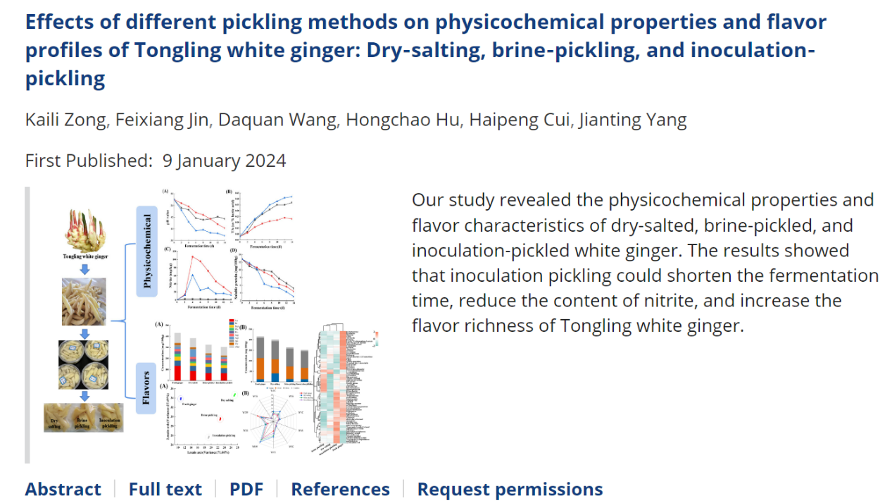 1月9日,我校果蔬精深加工与营养控制创新团队在农林科学领域二区期刊Food Science & Nutrition(IF=3.90)在线发表题为“Effects of different pickling methods on physicochemical properties and flavor profiles of Tongling white ginger: Dry‐salting, brine‐pickling, and inoculation‐pickling”的研究论文。我校食品工程学院2021级食品加工与安全领域研究生纵凯莉为第一作者,杨剑婷副教授为通讯作者,博业体育(中国)官方网站-登录入口为唯一完成单位。