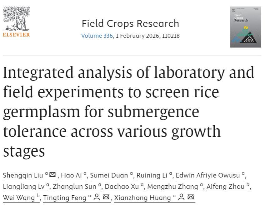 11月4日,Field Crops Research杂志(中科院一区TOP期刊)在线发表了我校安徽省教育厅优秀科研创新团队“水稻种质创新与应用基因组学创新团队”题为“Integrated analysis of laboratory and field experiments to screen rice germplasm for submergence tolerance across various growth stages”的研究论文。该研究构建了覆盖萌发–幼苗–分蘖期的多阶段耐淹综合评价体系,并筛选出四份在不同阶段均表现优良的耐淹水稻种质。