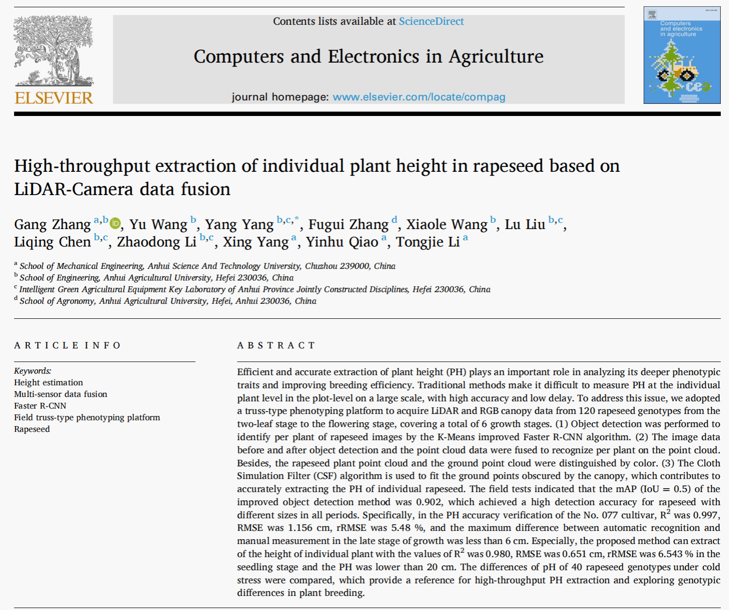 近日,我校智能制造学院教师张刚(第一单位/第一作者)在国际学术期刊《Computers and Electronics in Agriculture》(中科院1区TOP期刊(农林科学),IF:7.367)上发表了题为《High-throughput extraction of individual plant height in rapeseed based on LiDAR-Camera data fusion》的研究论文。该研究提出了一种基于雷达与相机数据融合的高通量油菜个体株高提取方法,实现了从两叶期至开花期多生长阶段下油菜株高的精准、高效测量,为作物育种表型分析提供了可靠的技术支撑。合作单位为安徽农业大学,研究得到了国家自然科学基金(32372003)、安徽省教育厅优秀青年人才项目(2022AH030090)、博业体育(中国)官方网站-登录入口横向科研项目(881709)等资助。