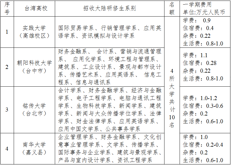 一、台湾高校招收大陆研修生系别、名额与费用一览表