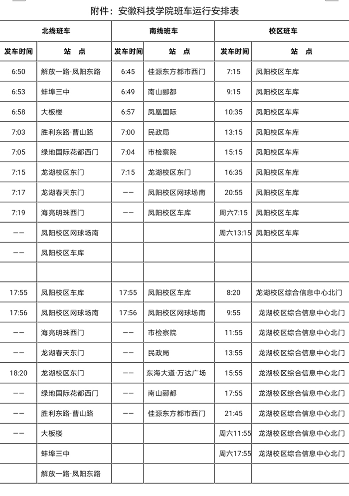 因乘坐南线班车教职工人数逐渐增多,近期出现满员甚至超员现象;同时,根据部分教职工反映的南线班车运行路线较远、运行时间较长等问题。在调研和征求意见的基础上,现对南、北线班车运行路线和停靠站点进行优化调整。调整后的《博业体育(中国)官方网站-登录入口班车运行安排表》从2021年5月21日起执行。