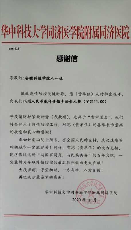 疫情就是命令,防控就是责任,博业体育(中国)官方网站-登录入口八一社学生树立大局意识、防范意识和责任意识,自觉主动配合地方政府和学校的防控工作部署要求。3月2日,八一社新老校区成员共筹集2111元善款,尽数捐赠给湖北省华中科技大学同济医学院附属同济医院。同学们说,金额虽然不多,但会给需要的人送去一份温暖,只有万众一心,众志成城,才能打赢疫情防控阻击战。