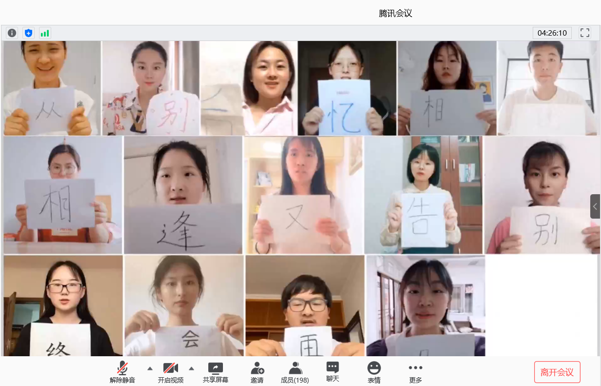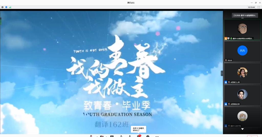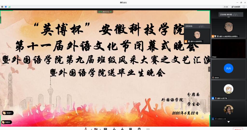 6月22日晚,外国语学院在腾讯会议上举行了“英博杯”博业体育(中国)官方网站-登录入口第十一届外语文化节闭幕式晚会暨第九届班级风采大赛文艺汇演暨送毕业生晚会。外国语学院院长陈德用、党总支书记蔡为青、副院长刘萍及师生代表参加。此外,班级风采大赛文艺汇演邀请动物科学学院学生会主席孙静、资源与环境学院学生会主席吴柳莹、人文学院学生会主席徐鹏飞,外国语学院六届二任学生会主席杨妍,英语162班班长张寻、外国语学院六届一任学生会文艺部部长宫思远、翻译161班团支书陈慧仁7名同学担任评委,晚会由英语182班刘珍珍和翻译182班胡玉辰2位同学主持。