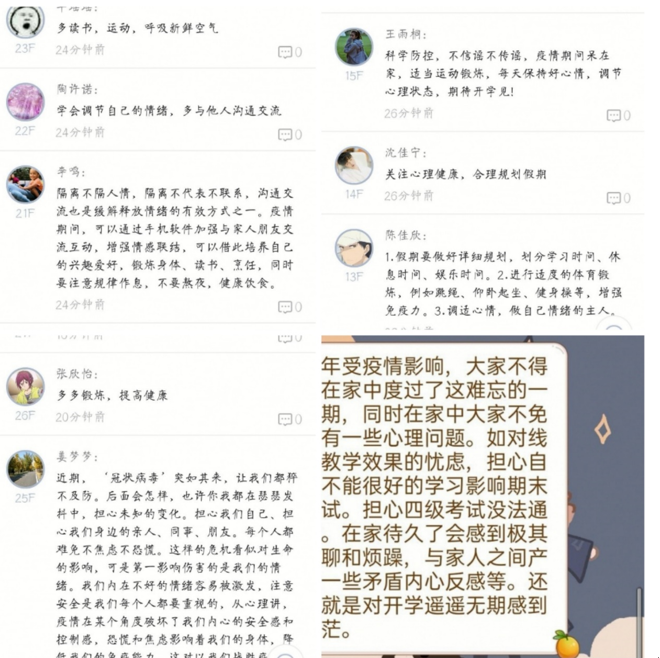 各团支部借助易班、QQ、腾讯会议等新媒体平台,通过“云讲座”,“云论坛”、“云沟通”、“云帮扶”等形式开展了各具特色的线上主题团日活动,各班级借此机会向班级学生普及了心理健康的相关知识,提高了同学们对自己及他人的心理健康关注度,让同学们在家也能够保持积极乐观的生活态度。各班级从宿舍收集的问题,放置在易班班级微社区进行讨论、交流,此外,同学分享了个人解决心理健康问题的方法及心得体会。