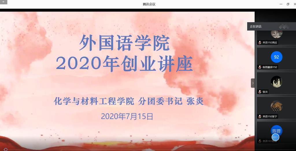 为引导学院学生了解创新创业知识,激发创业热情,培养创新精神和创业意识,提高创新实践能力和参加创新创业类比赛的水平。外国语学院于7月15日晚上在腾讯会议上举办了2020年创业讲座,特邀化学与材料工程学院党总支秘书、分团委书记、创业培训讲师张炎主讲,学院党总支书记蔡为青,分团委书记陈慧中,专职辅导员宋兵兵出席本次讲座,学院各班级班长、支书,各班级参加“互联网+”、挑战杯、创青春、三创比赛等创业比赛的团队全体成员参会,本次讲座由宋兵兵主持。