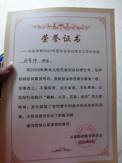 机械设计制造及其自动化193班许黄帅的家乡肥东县长临河镇也是今年受灾严重的地区之一,在团县委的号召下,他参加了灾区人民群众的后勤保障志愿服务,每天对长临河中学安置村民分发生活物资、做好灾民登记、帮助打扫卫生、消除安全隐患……十几天的征途,短暂却意义非凡,作为一名亲历者,许黄帅深切感受到作为00后的一代应有的担当、责任。