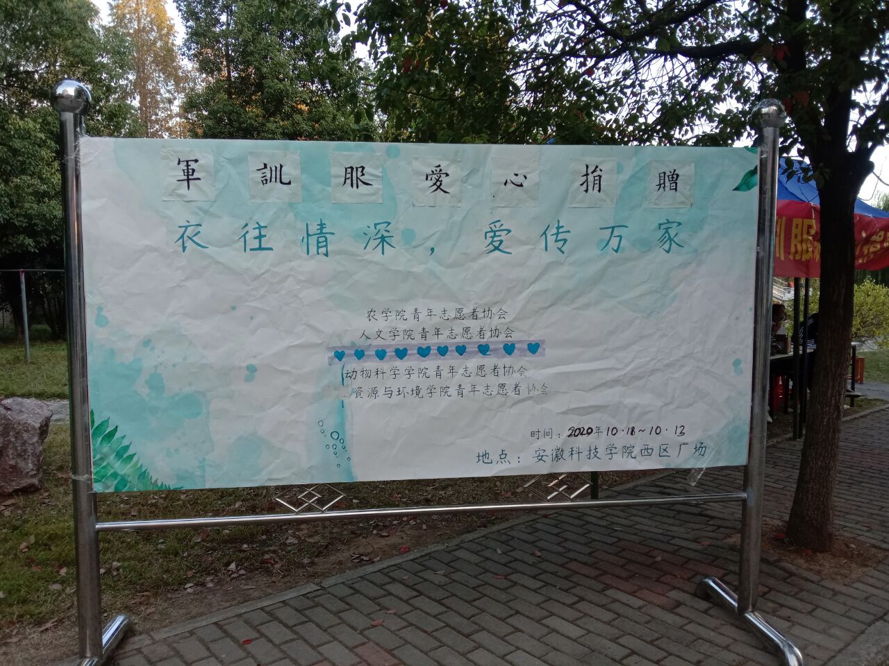 此次活动在凤阳校区东区和西区分别设立了捐赠点。活动开始之前,2019级的同学通过贴海报、发官方QQ、拉横幅、做展板等宣传方式,扩大了活动的知晓度。准备工作完成后,2020级新生便带着自己洗干净的、叠得整整齐齐的军训服来到捐赠现场,献出自己的一份爱心。青年志愿者们耐心地接待每一位前来捐赠的新生,引导新生进行信息登记,并进行有序捐赠。