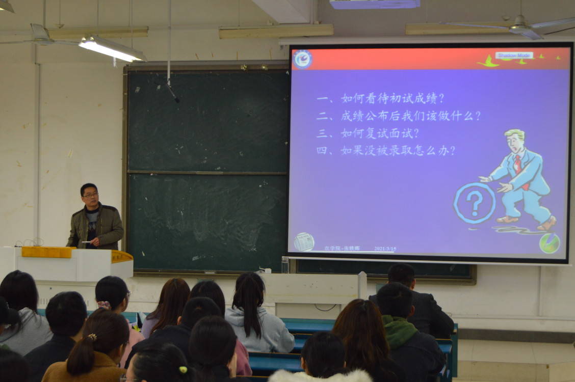 张轶辉借助历年研究生复试面试经典案例,从“如何看待初试成绩、成绩公布后我们该做什么、如何准备复试面试、如果没被录取怎么办”等四个方面详细介绍了复试面试前前后后的内容。辅导紧扣农学院学生实际,举例丰富,在掌声中圆满落下帷幕。