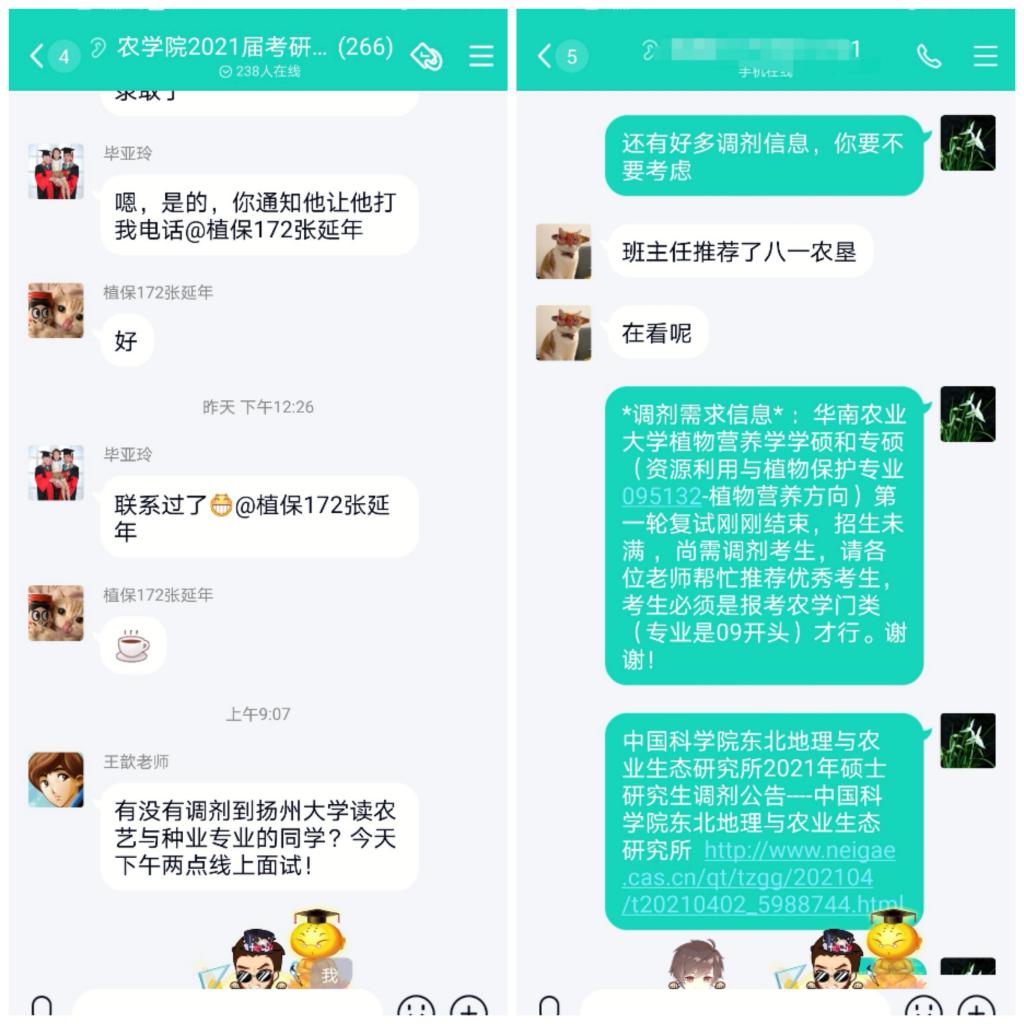 农学院一直十分关心、支持学生考研。每年7月建考研指导群,每年邀请学院考研辅导专家进行研究生报考、复试面试指导,各班主任进行考研一对一指导。农学院教师时刻了解同学们复试面试状况,及时为受挫同学打气加油,为考研学子提供周到服务关怀。