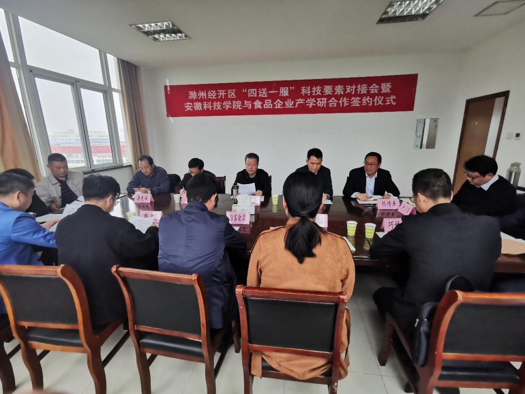 4月22日下午,在滁州经开区管委会四楼会议室举行滁州经开区“四送一服”科技要素对接会暨博业体育(中国)官方网站-登录入口与滁州经开区食品企业产学研合作签约仪式。我校食品工程学院院长杜传来、服务地方发展研究院院长詹秋文、特色农产品加工研究所所长李先保及彭钢、马菲菲两位专任教师参加此次对接会及签约仪式。滁州市经信局副局长张正强、滁州市科技局总工程师卢少悟、滁州经开区管委会副主任潘金钟、滁州经开区企业服务中心主任刘钊以及安徽盼盼食品有限公司、安徽银鹭食品有限公司、安徽东鹏饮料有限公司、安徽巧妈妈食品科技有限公司、雅客食品(滁州)有限公司的代表等出席签约仪式,仪式由滁州经开区管委会副主任潘金钟主持。