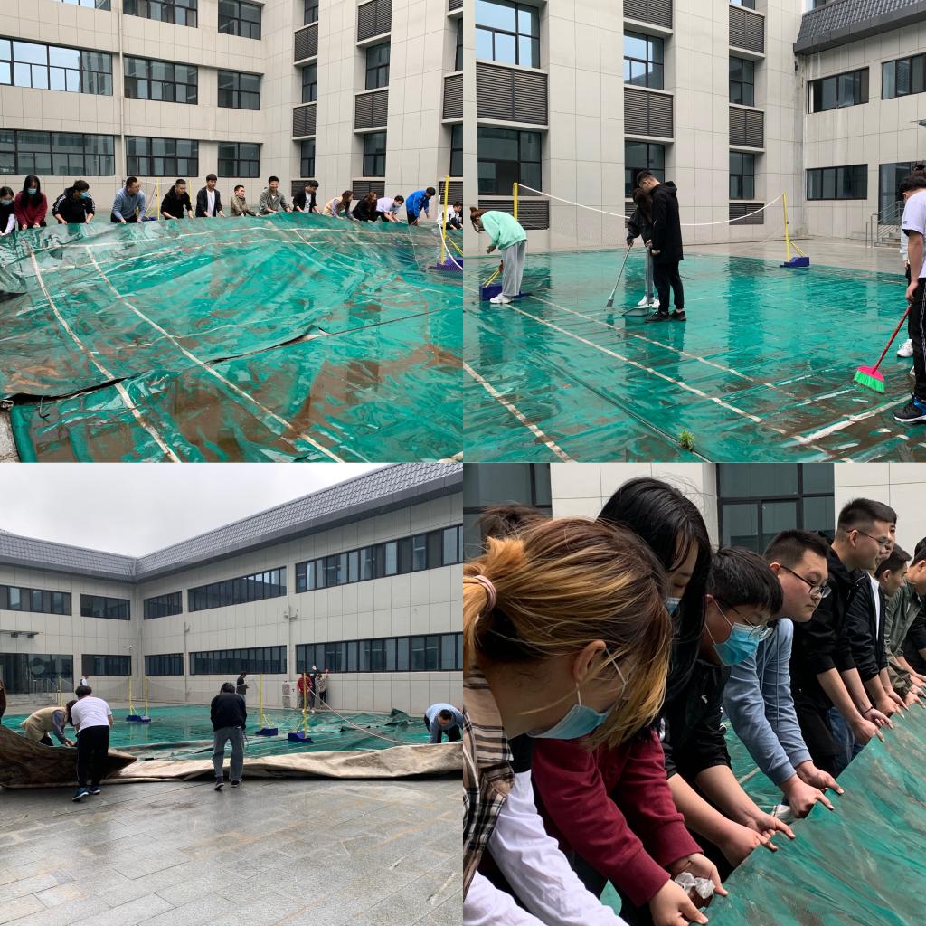 同学们首先对被暴雨冲乱的一楼空场地进行了打扫和整理,一起将掀翻的羽毛球胶地铺开整平,清扫干净。接着,他们手持工具,对场地周边比较难去除的污迹进行了清除,女生用抹布擦拭,捡走树叶和垃圾,男生们则用拖把用力清理胶皮上的污渍,不断冲刷。经过一个多小时的劳动,脏乱的场景不见了,干净整洁的场地和楼道呈现出来,同学们分享着劳动成果,享受着劳动的过程。