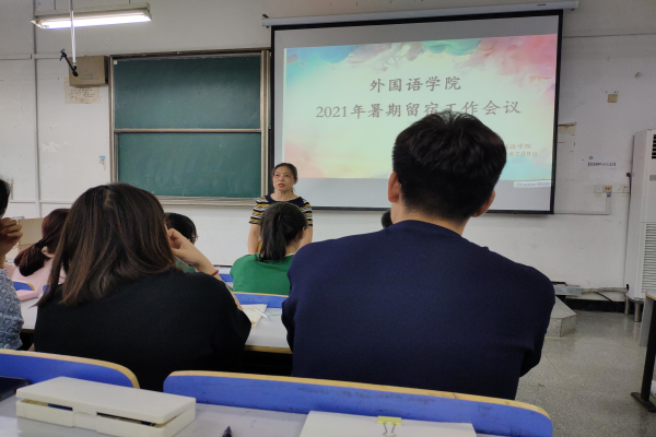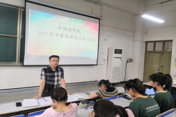 为加强暑期留校学生管理服务工作,切实维护好校园安全稳定,7月8日下午,外国语学院在求A106教室召开暑期留校学生工作会议。学院党委书记蔡为青、党委副书记张海亮、团委副书记宋兵兵出席会议,学院全体申请留宿学生参加会议,会议由张海亮主持。