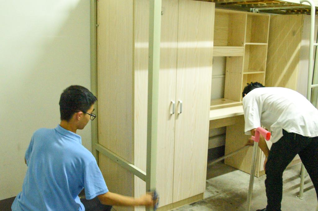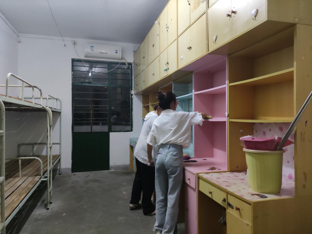 志愿者们自己带来了抹布,扫把等工具,认真细致的擦拭桌椅、去除污渍、清洁地板,不留下任何一个卫生死角,从床板床沿,到衣柜桌椅,都进行了彻底清洁,没有一丝懈怠,每个人都积极投入到打扫中,热火朝天地忙碌着。志愿者们打扫后,寝室环境焕然一新。