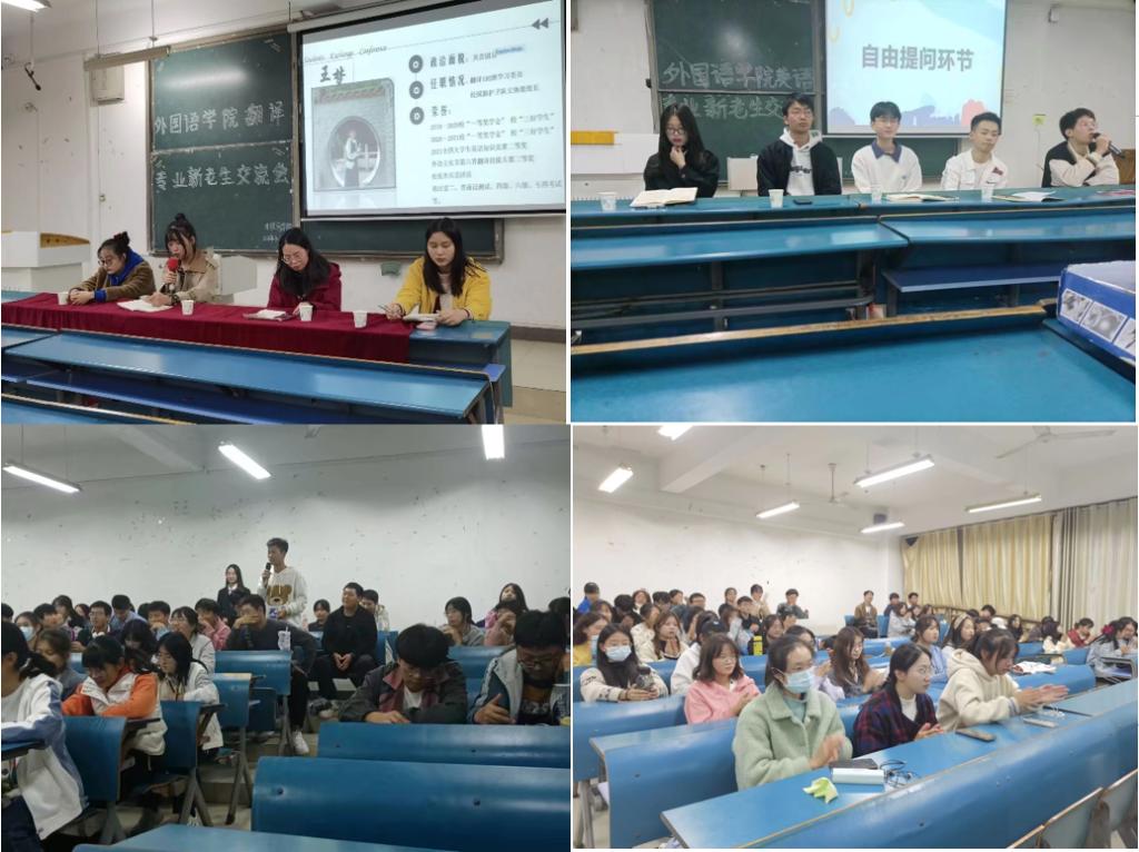 为帮助新生更快融入崭新的大学生活,明确大学目标,外国语学院于10月23日晚上分专业举行新老生经验交流会,邀请学院9名高年级优秀学生担任嘉宾,2021级全体新生参加,交流会由外国语学院学生会主持队成员主持。
