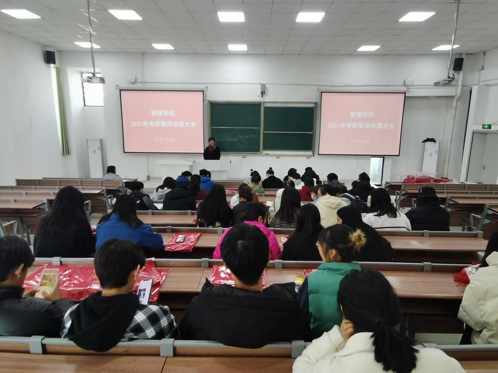 在全国硕士研究生招生考试最后30天关头,为进一步坚定学生考研信心,对2021年考研学子再动员、再鼓劲、再慰问,11月26日上午,管理学院在致知楼B111教室举行2021年考研誓师大会。学院党委副书记、纪委书记陶漫,副院长郑谦,团委副书记方辛、江旭聪出席会议并为考研学生送上祝福。