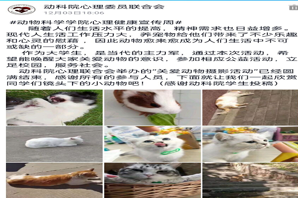 为广泛宣传心理健康知识,在全院营造关注心理健康、懂得心理健康、重视心理健康的浓厚氛围,12月上旬,动物科学学院举办了主题为“关爱动物,传递爱心,尊重生命”的“12 15”大学生心理健康月系列活动。