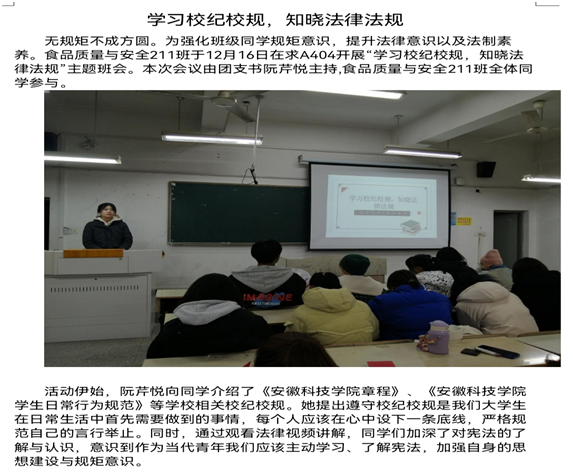 为进一步加强法治宣传教育,贯彻落实学校要求,各班级组织学生登录普法网,认真学习宪法知识,深入学习习近平新时代中国特色社会主义思想,进一步增强法治意识,坚持爱党爱国爱社会主义高度统一。同时,按照要求,各班级组织开展了学校规校纪和学法律知识主题班会,班级主要学生干部在班会上进一步宣讲《博业体育(中国)官方网站-登录入口章程》《博业体育(中国)官方网站-登录入口学生日常行为规范》《博业体育(中国)官方网站-登录入口学生违纪处分办法》《普通高等学校学生管理规定》等校规校纪和法律知识,教育引导同学们掌握法律知识,做一名遵纪守法的好学生。