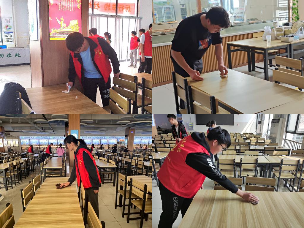 活动中,志愿者们根据任务分工,手拿抹布认真而仔细地清洁餐盘回收工作台、就餐桌椅以及筷子橱柜等卫生区的每个角落,用自己一丝不苟的态度展现着对志愿服务工作的热情,用自己的实际劳动诠释着对师生的关心、关爱,一道道红色身影来回穿梭在师生就餐的桌前身后,使食堂的就餐环境变得更加干净整洁,为师生们营造出一个舒适的就餐环境。志愿者们在活动中体验了食堂工作人员的辛苦,提醒就餐的同学尽量保持桌面干净。活动结束后,同学们纷纷表示,今后要用自己的实际行动感召每一位同学,爱护环境、服务师生、为创建美丽校园贡献自己的一份力。