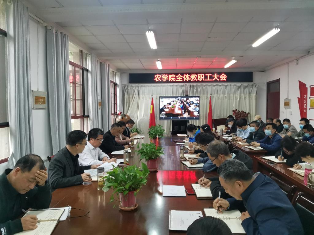 5月11日下午,农学院在学院会议室召开全体教职工会议,部署疫情防控和教育教学等工作。会议采用线下和线上结合的形式进行,学院党政领导和全体教职工参加会议。会议由学院党委副书记、院长崔广荣主持。