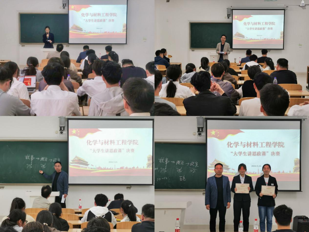 为充分发挥思政课立德树人关键课程作用,提升大学生思想理论水平,5月11日下午,化学与材料工程学院于致知楼A305教室举办了以“青春献礼党的二十大,强国有我新征程”为主题的”大学生讲思政课”比赛。学院副院长李子荣、学院党委副书记张炎、马克思主义学院教师黄钦海担任评委。