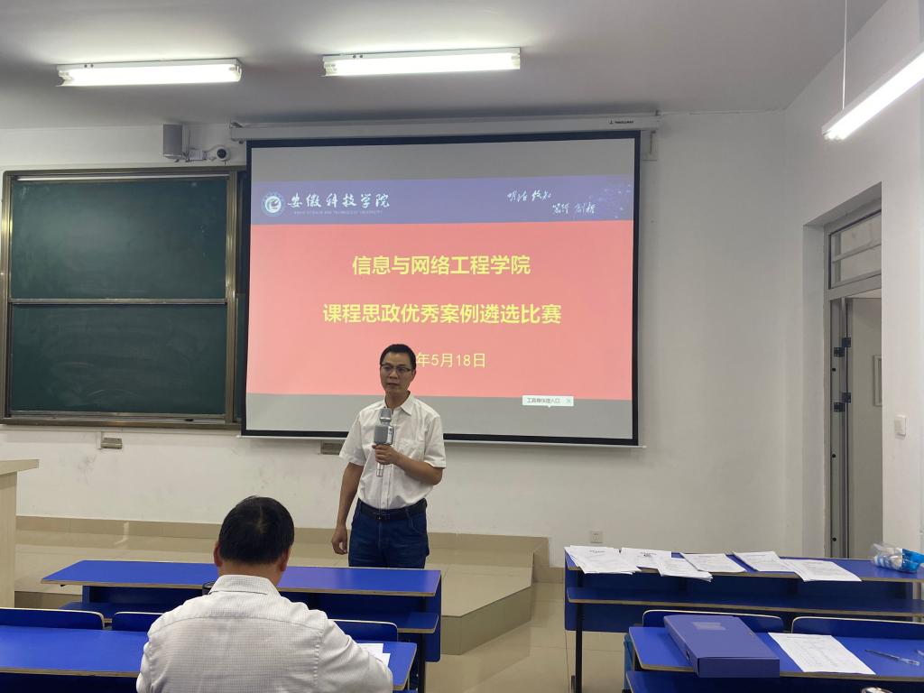为进一步推进课程思政优秀案例库建设,5月18日下午,信息与网络工程学院在尚行楼C202开展课程思政优秀案例遴选比赛。教务处副处长高青海教授、电气与电子工程学院李勇教授、第二届全国高校思政理论课教学展示暨优秀课程观摩活动二等奖获得者赵仁青副教授等三位老师担任本次比赛的专家评委,学院全体专业教师观摩比赛,信息与网络工程学院副院长曹浩担任主持。