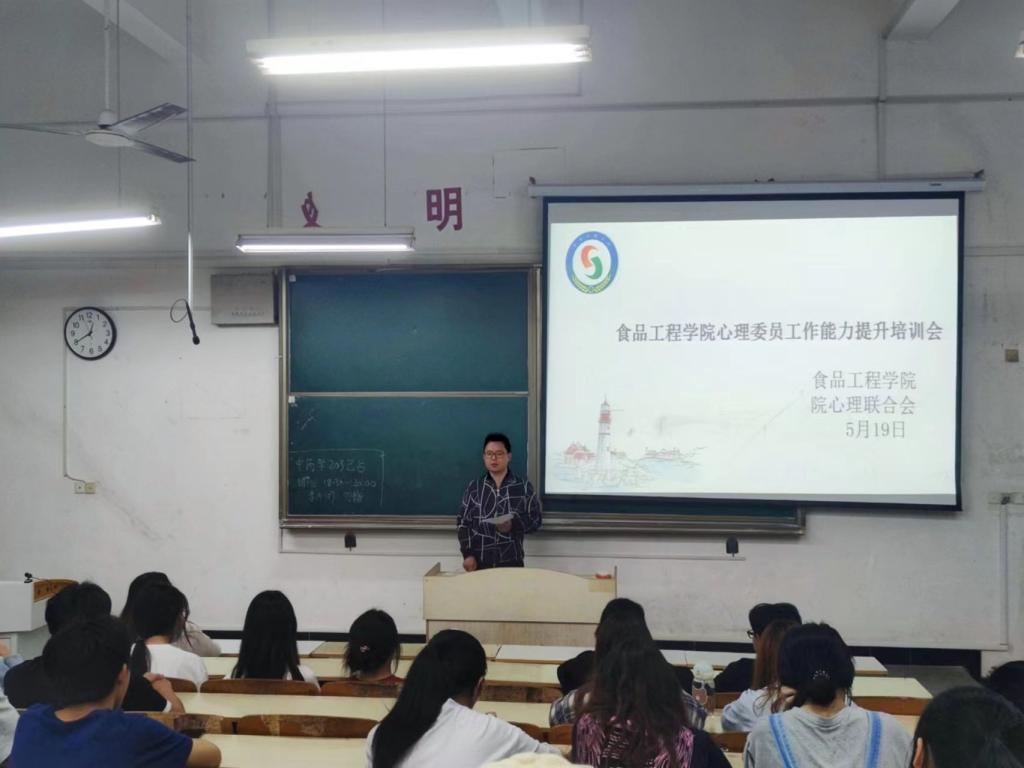 为进一步提升学院心理委员的工作责任心和工作能力,推进学院心理健康教育工作。根据学校5.25大学生心理健康月系列活动工作要求,5月19日中午,食品工程学院在求A107举办心理委员工作能力提升培训会。学院专职辅导员杨勇、院学生心理委员联合会全体成员以及各班心理委员参加培训会。