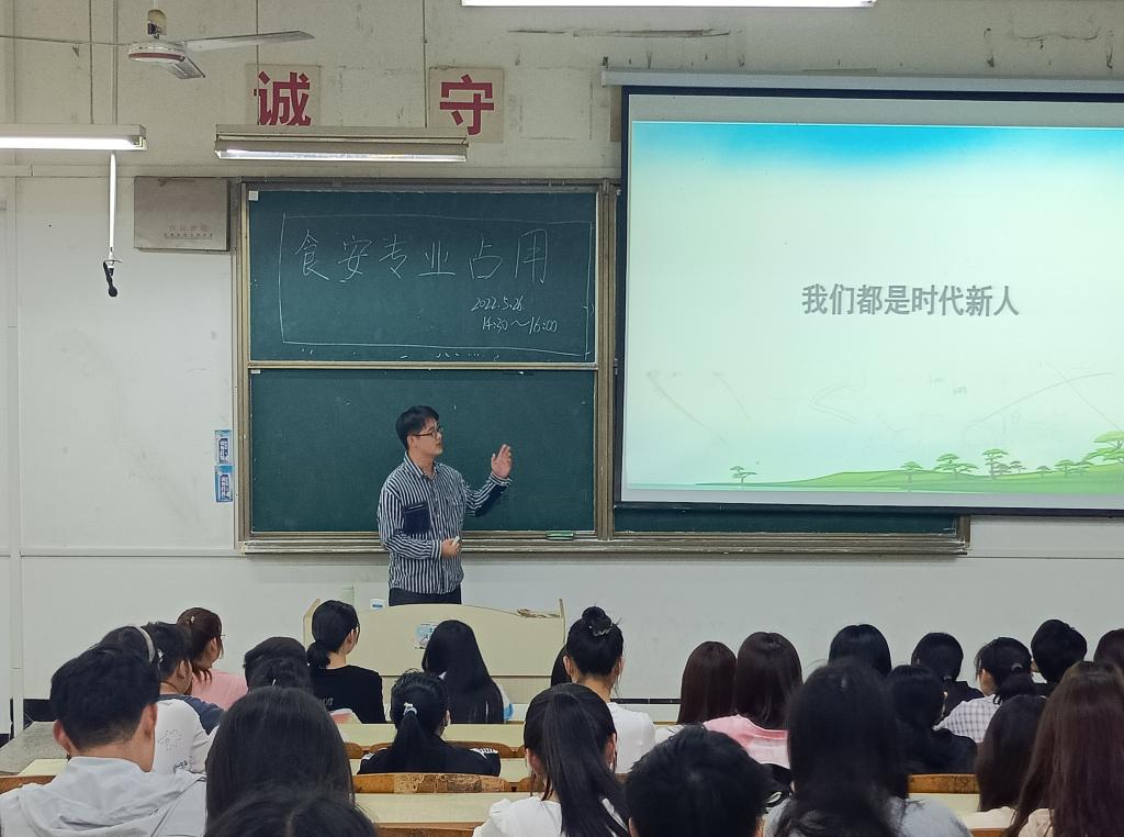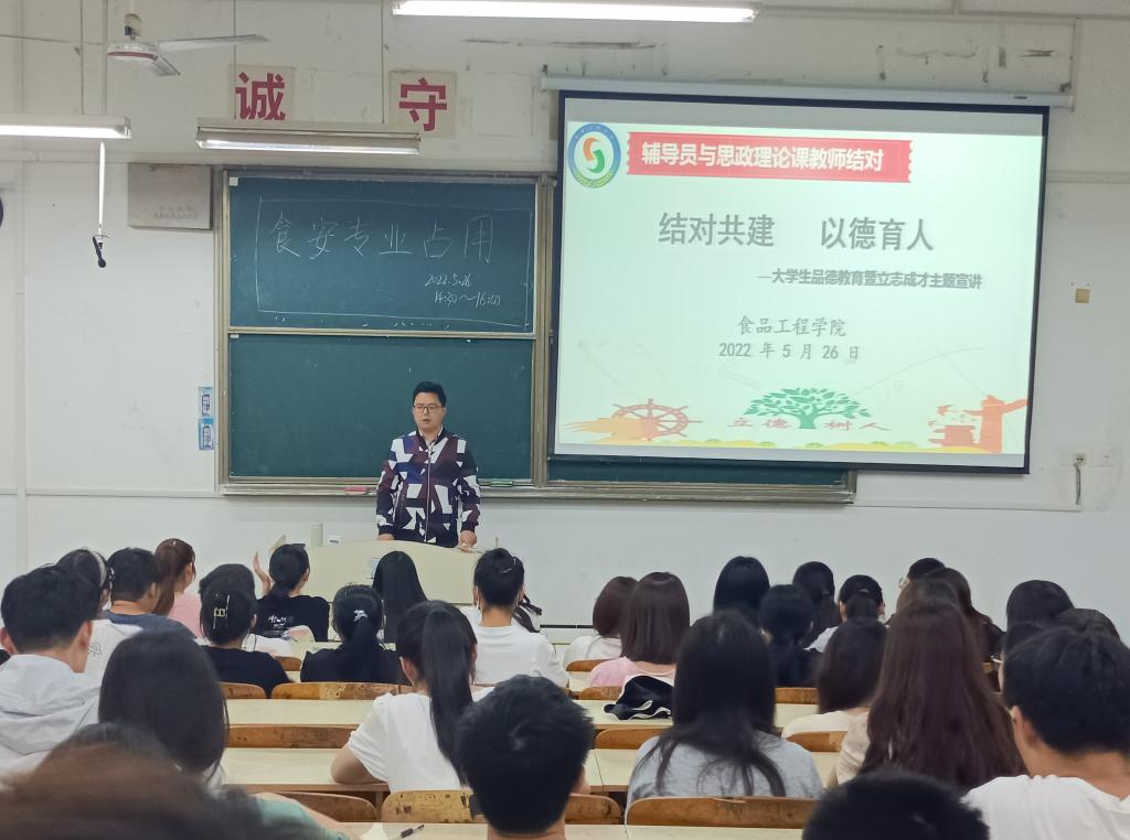 为加强大学生品德教育,培育和践行社会主义核心价值观,教育引导同学们在新时代树立正确的人生目标,激励他们奋发向上。5月26日下午,食品工程学院在求知楼A105举办“习近平总书记在中国人民大学考察时重要讲话精神”专题学习暨大学生立德立志成才主题宣讲。作为学院辅导员与思政理论课教师结对共建活动之一,本次宣讲特邀马克思主义学院思想道德与法律修养教研室王金跃老师作为主讲人,学院2020级、2021级同学参加。活动由专职辅导员杨勇主持。