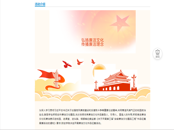为营造风清气正的校园政治生态,鼓励学生积极创作廉洁文化精品,充分发挥优秀廉洁文化作品激励人、引导人、塑造人的作用,5月28日-29日财经学院在易班上开展廉洁文化作品征集活动。
