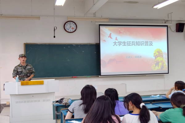 为鼓励大学生积极应征入伍,6月9日晚,外国语学院在新知楼A203教室举办大学生应征入伍政策宣讲会,会议邀请了退役士兵、2020级英语专业学生宋晓波担任主讲,21级全体学生聆听宣讲,会议由专职辅导员张薇薇主持。