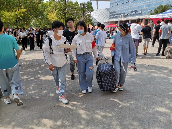 支部全体党员早早来到迎新现场,佩戴好口罩,以昂扬的精神面貌迅速参与到相关志愿活动中去。有的党员负责新生报到检录工作,有的党员负责接送新生,他们接过已消毒的行李箱,协助新生完成一系列报道手续后,把新生平安送到寝室。在带领新生去往寝室的路上,党员们与新生亲切的交谈起来,认真地向学弟学妹们介绍校园环境、学院概况,专业特色、大学生活等,并嘱咐学弟学妹谨防电信诈骗,确保财产安全,督促学弟学妹提高防范安全防范意识。