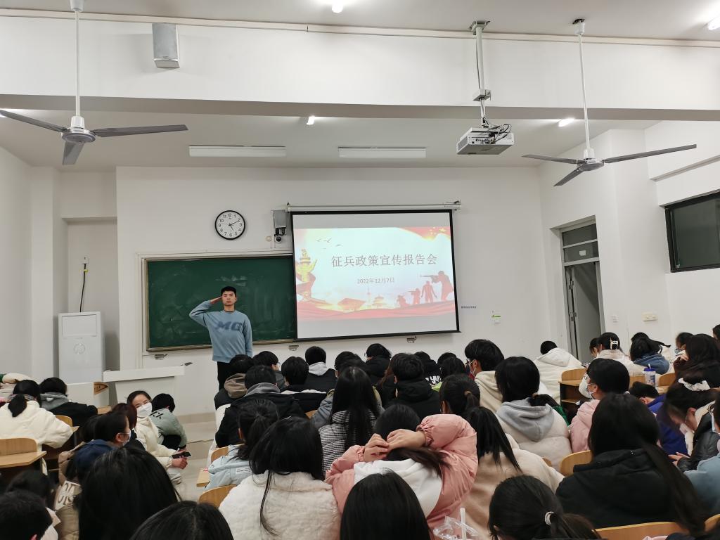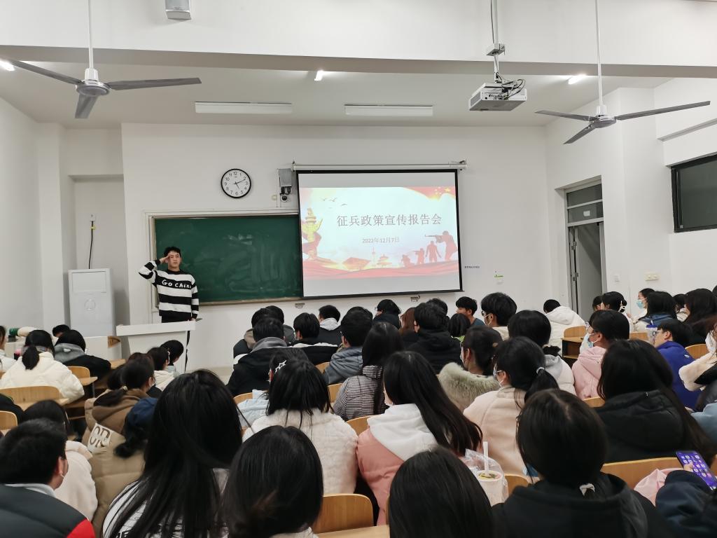 为进一步做好大学生应征入伍工作,12月7日,财经学院举办征兵宣传教育大会。退役士兵朱浩宇、袁兴隆两位优秀退役大学生应邀宣讲。学院有当兵意向的学生参加了宣讲会,大会由学院辅导员王天云主持。