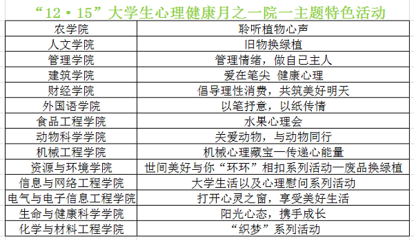 学院创新活动形式,积极把心理健康与学院专业紧密结合起来,开展了具有学院特色的主题教育活动,如资源与环境学院的‘世间美好,与你“环环”相扣系列活动——旧物换绿植’、农学院的“聆听植物心声”、建筑学院的“爱在笔尖,绘出心声”等。活动形式多种多样,活动内容丰富多彩,线上的观影、心理读书会和线下的趣味团体游戏、水果盛宴、心理藏宝等活动让学生在全身心投入中多方面成长。