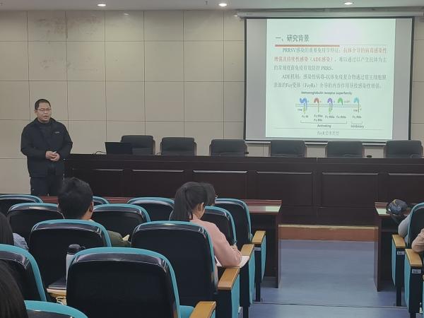 张留君博士以《PAMs中的激活型FcγRs对PRRSV-ADE感染中天然抗病毒免疫应答的影响》为题,阐述了PRRSV-ADE感染可能通过激活型的FcγRs抑制PAMs中的天然抗病毒免疫应答,从而增强病毒感染并有利于其持续性感染。研究结果完善了PRRSV-ADE感染的作用机制,为PRRS新型疫苗开发提供了指导。