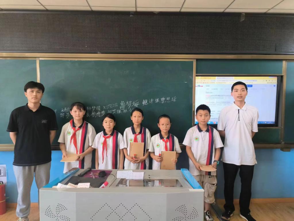 经团队成员分享得知淮南市谢家集区孤堆小学的教学条件较为落后,学生部分兴趣文化课缺失。团队联系到了淮南市谢家集区孤堆小学校长,做好基本情况的了解与活动计划沟通,决定针对该校五年级留守儿童开展“关爱陪伴兴趣课”活动。支教活动于7月11日在孤堆小学正式开展,团队准备了《沁园春 雪》、《水调歌头》等二十余首古诗,举办了诗文朗诵比赛,并准备了钢笔、练习册、零食等作为奖品。比赛结束后,实践团队与同学们一起观看了具有成长意义的电影《头脑特工队》,并有幸邀请到了淮南二中的音乐老师章老师,给同学们上了一节音乐课。最后,团队和同学们一起完成绘画涂色作品,叠桃子、千纸鹤等折纸艺术活动。
