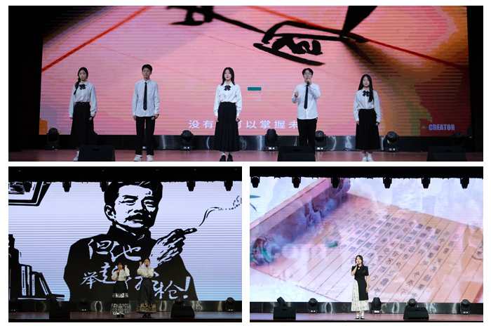 比赛在深沉有力的《我骄傲,我是中国人》作品诵读中拉开帷幕,李杨等四位同学带来了字字铿锵的《英雄归来》,歌颂了为争取民族独立和人民解放无私奉献出生命的英烈;李想等六位同学自信大气地演绎《密码》,讴歌了中国共产党建党以来我国取得的卓越成就,将现场观众带入几十年前那段国士以身许国、舍生忘死的历史岁月。参赛选手吐字标准,归音到位,声音色彩丰富,感情充沛饱满,充分展现了中华经典诗文超越时空的精神力量和朗诵艺术的感染力,赢得在场师生的阵阵掌声。