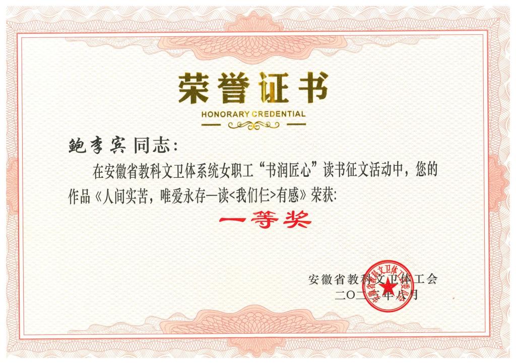 近日,省教科文卫体工会发文《关于安徽教科文卫体系统女职工“书润匠心”读书征文活动获奖情况通报》。我校图书馆鲍李宾老师荣获一等奖。