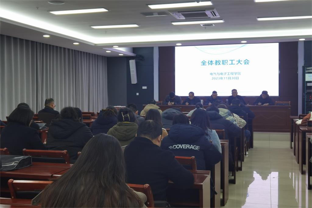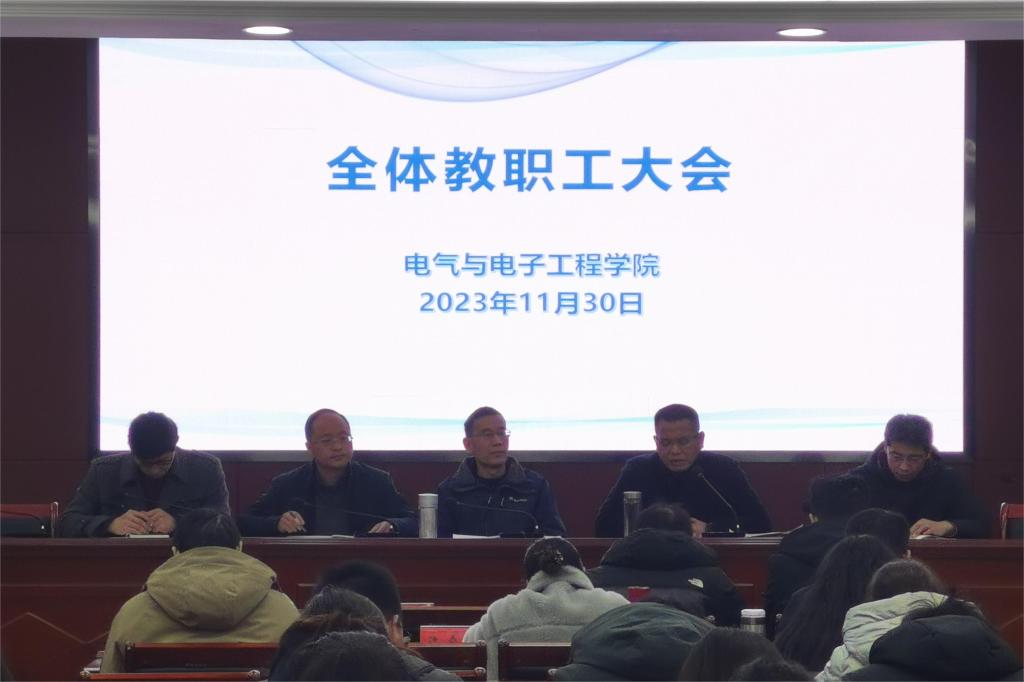 11月30日下午,电气与电子工程学院在西辅楼111会议室召开全体教职工大会,学院党政领导及全体教职工参加了会议,会议由学院党委书记骆海邦主持。