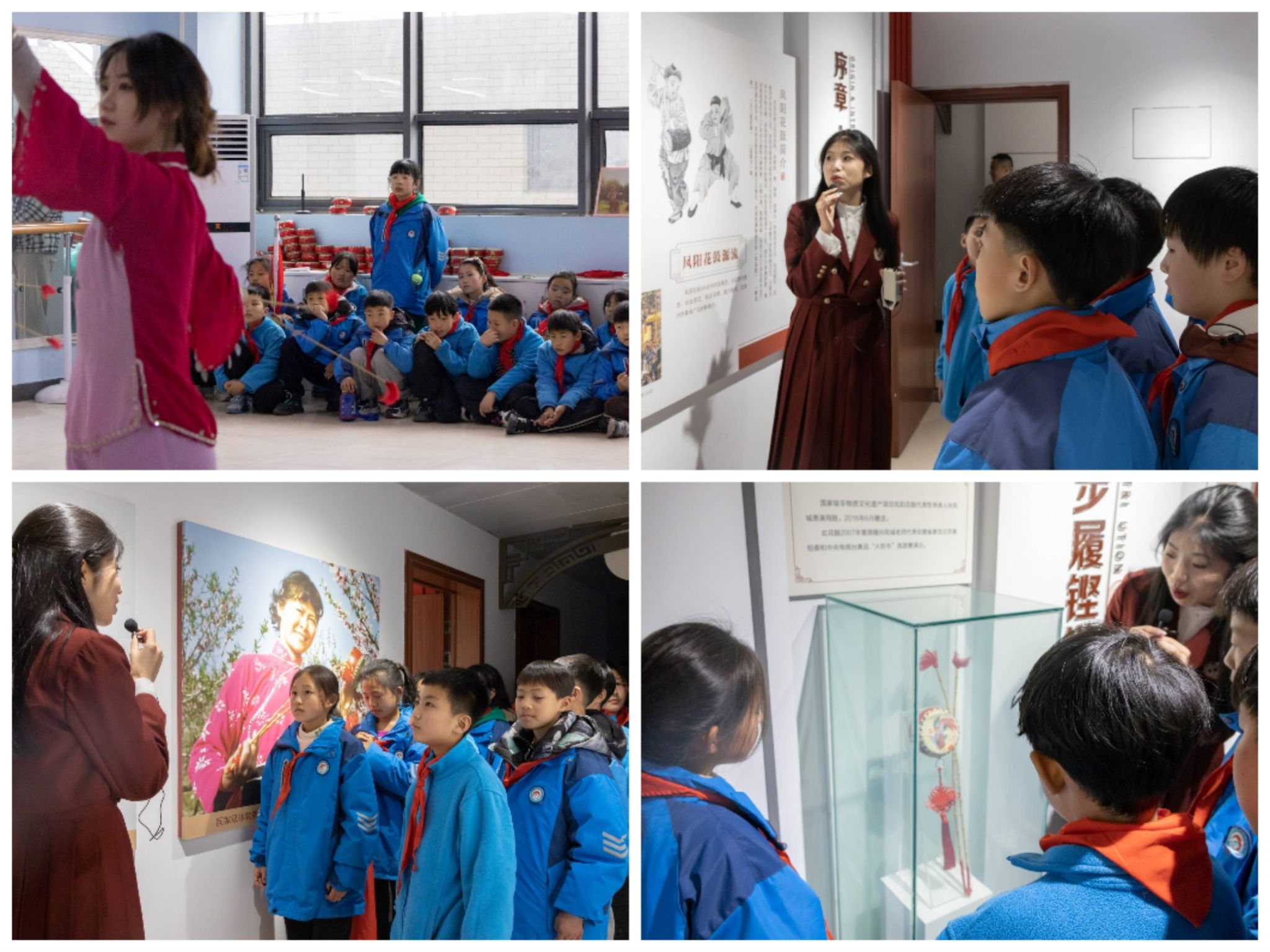 在我校凤阳花鼓创新成果展厅,小学生们认真边看边问,认真了解凤阳花鼓的历史演变和艺术特色,他们还通过多媒体互动,直观地感受到了这一非物质文化遗产的独特魅力。展厅中的实物展示和生动的解说,让小学生们对凤阳花鼓有了更深刻的认识。