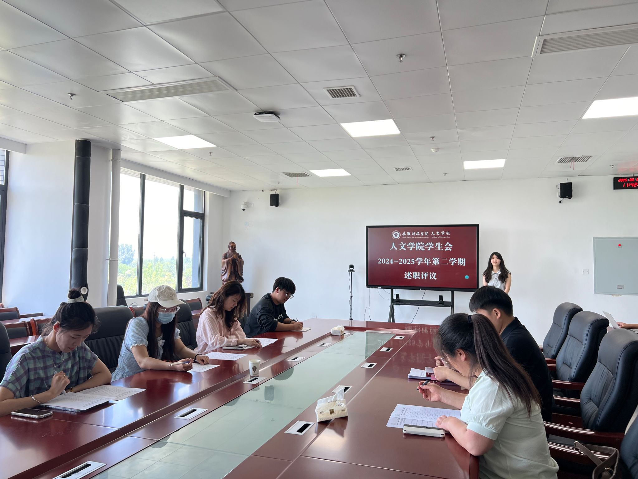 6月6日,人文学院在学院会议室召开学生会2024-2025学年第二学期工作述职会议,学院党委副书记李沙娜、学生会指导老师徐琦琦和学生会主席团成员参会并进行评议。