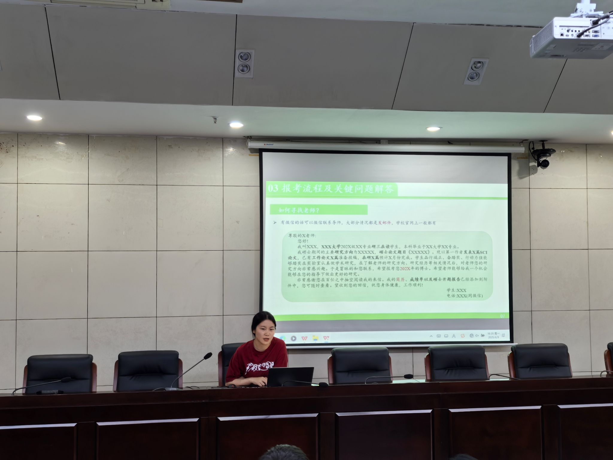成功升博的研究生毕业生代表罗春梅、钱丽娟、杨婷婷分别从博士招考类型、基本要求、专业学校选择、导师选择联系、申请流程、面试考核等细致入微地介绍了申博历程,分享了感悟感想,并号召与会同学们重视科研积累、科研成果凝练、英语四六级学习等。