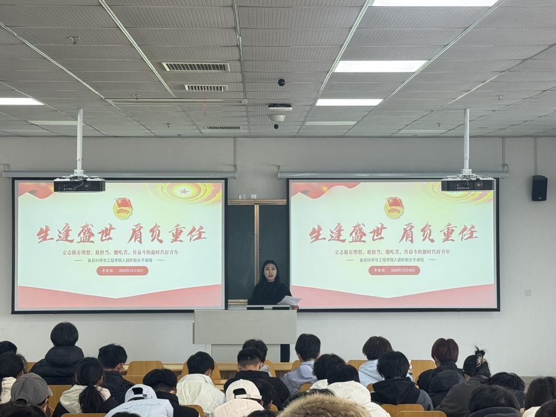 本次培训以“生逢盛世,肩负重任”为主题,李彤彤以生动鲜活的语言、丰富翔实的事例,围绕“忆往昔 看峥嵘岁月”“看今朝 敬奋斗当时”“展未来 感使命在肩”三大篇章展开讲述。在“忆往昔 看峥嵘岁月”部分,李老师深情讲述了赵一曼、林觉民、刘胡兰、杨靖宇等革命先辈的英勇事迹,带领同学们重温那段波澜壮阔的奋斗历史,感悟先烈们坚定的理想信念与无私的奉献精神。进入“看今朝 敬奋斗当时”篇章,李老师将目光投向新时代,生动介绍了陈祥榕、黄文秀、江梦南等当代青年楷模的感人事迹。他们或在边防一线英勇捍卫国土,或在基层一线倾情奉献,或在逆境中自强不息、勇攀高峰,以不同方式诠释了新时代中国青年的担当与风采。最后,在“展未来 感使命在肩”部分,李老师结合食品专业特色与时代要求,对全体入团积极分子提出三点期望:一要坚定理想信念,筑牢信仰之基,自觉将个人理想融入国家发展大局;二要勤奋刻苦学习,提升能力本领,努力掌握专业知识与技能,成为未来的行业栋梁;三要勇担社会责任,积极奉献力量,在实践中锤炼品格,以实际行动服务社会、报效国家。