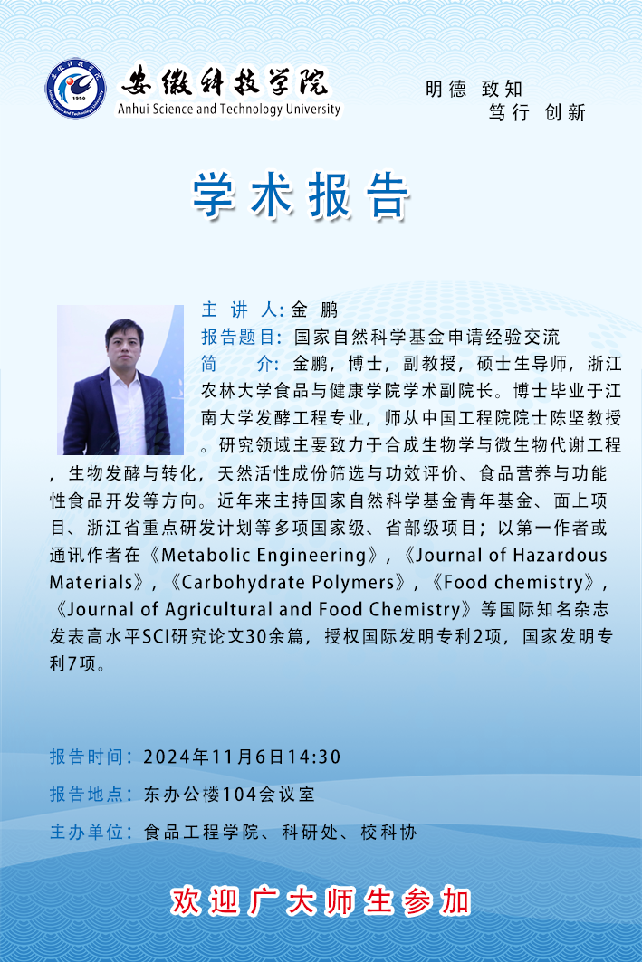 【日期:2024年11月04日】 【单位:科研处 校科协 食品科学学院】 【作者:钱晶晶】