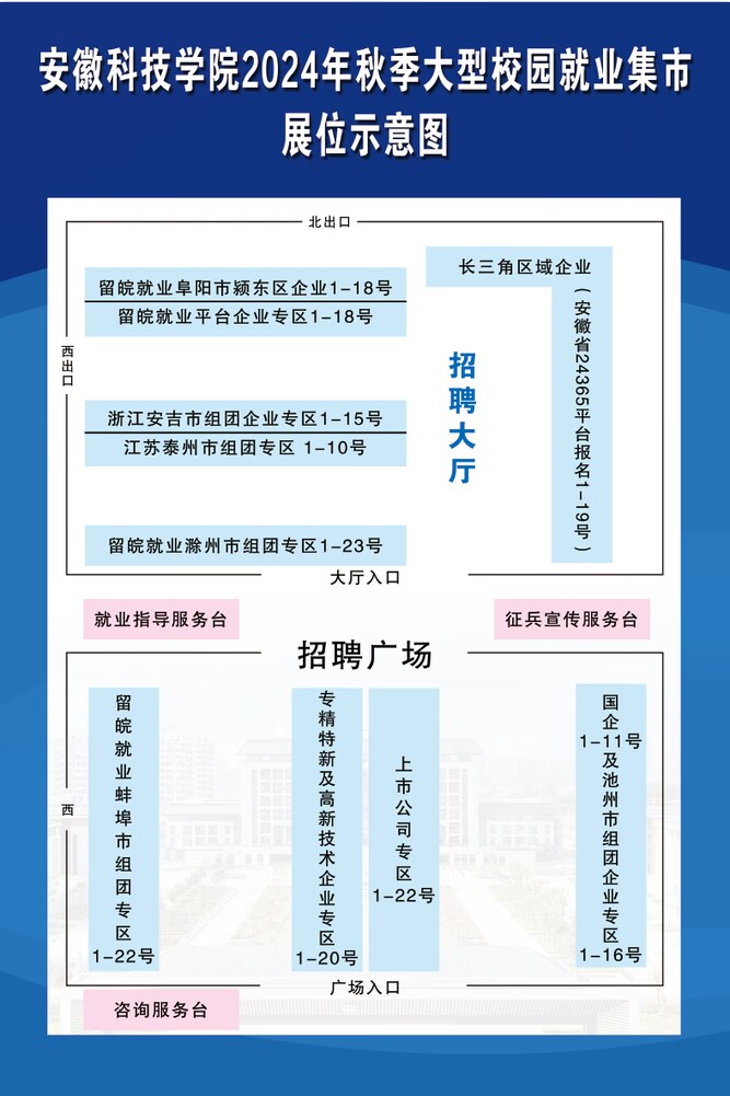 感谢贵司参加我校“人才兴皖 ‘就’在江淮”2025届毕业生秋季大型就业市场,请于13:00到蚌埠龙湖校区招聘场地布展,学校提供展位和企业标识牌,招聘海报请自行携带!如需宣讲,请到招聘会咨询服务台预约!请自驾来校提前联系就业指导中心孔老师登记入校车牌,乘坐高铁来校企业可从蚌埠南站下车,打车从龙湖校区西门进校!