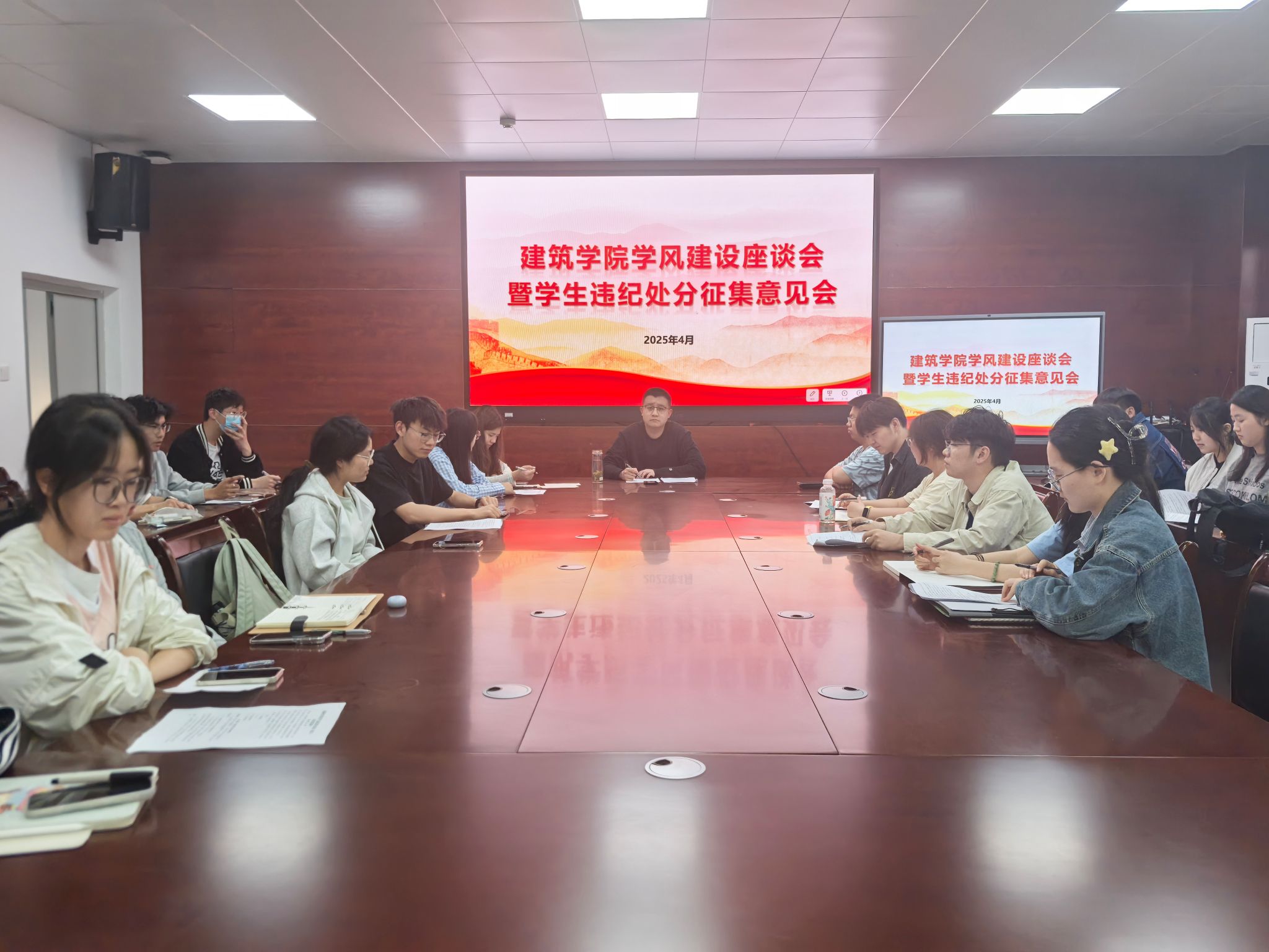 为进一步强化学风建设,完善学生管理制度。建筑学院于2025年4月15日在尚行楼A301召开学风建设座谈会暨学生违纪处分征集意见会,学院学生组织代表、各班级主要学生干部代表参加。会议由辅导员王明哲主持。