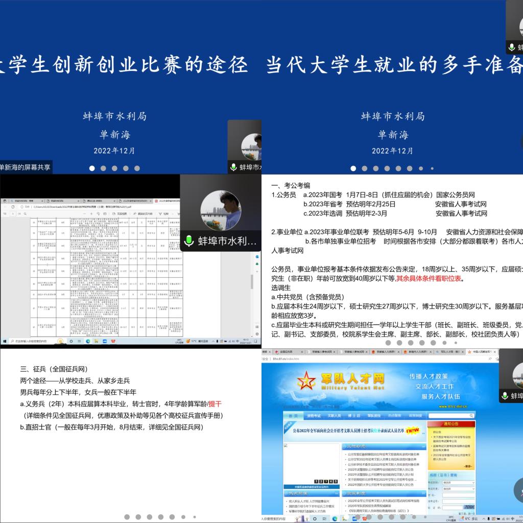 本次讲座通过线上和线下相结合的方式,单新海和大家分享了自己的大学生活、在校学习经历和毕业求职过程,从考公考编、就业、征兵等角度展开,建议大家职业发展需要从多方面准备。