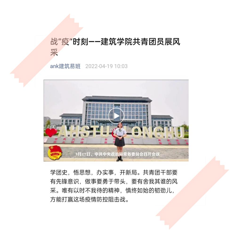 团支部录制的《战“疫”——共青团员的中坚》视频,充分体现了广大团员青年在疫情防控阻击战中贡献青春力量的热情和决心。视频中,张雨欣同学就当下疫情形势进行了系统地讲解,她号召全体共青团员要发挥党的助手和后备军作用,带领班级学生积极作为。罗志娟同学讲述了疫情防控期间建筑学院学子积极参加劳动实践、体育锻炼和文化活动,号召广大青年继续争当表率,以实际行动坚定战胜疫情的决心和勇气。该视频在博业体育(中国)官方网站-登录入口建筑学院易班微信平台发布后,反响良好,得到师生一致好评。