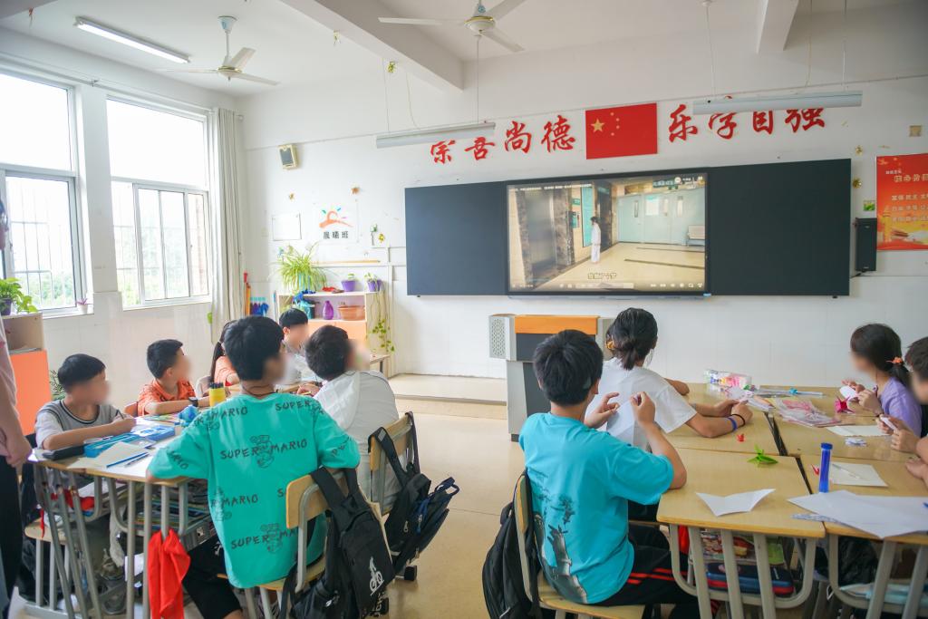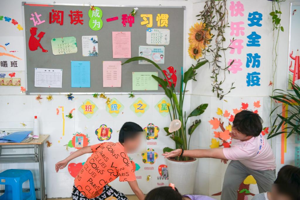 当《孤勇者》的前奏响起,团队成员花凯旋和李席旺的激情弹唱带动了全场。“人只有不完美值得歌颂”“谁说站在光里的才算英雄”一句一句的歌词,鼓舞着教室里的每一位听众。孩子们欢呼雀跃、手舞足蹈,拉上班主任向团队成员点歌一首《童年》。随着一声声“池塘边的榕树上,知了在声声叫着夏天”,团队成员们仿佛也回到了童年的夏天,每个人脸上都露出天真的笑容。孩子们的语言和听力虽有障碍,但是带着人工耳蜗的他们也能听到感受到音乐的律动,跟着大哥哥大姐姐一起晃动身体,享受着音乐,沉浸在奇妙的体验当中。