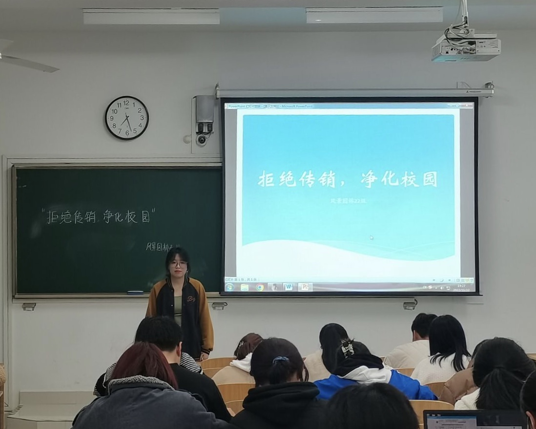 各班级主题班会以PPT解说、播放视频等形式展开,班会内容涵盖学生可能遇到的传销陷阱、怎样防范传销、传销常见手段、传销表现特征等多个方面。各班级主讲耐心向同学们讲解传销的危害以及防范措施,引导学生们加强自我管理,做到识别传销,远离传销。拒绝传销不仅是责任,更是一种使命和担当。同学们纷纷表示通过本次学习,认清了传销违法犯罪活动的欺诈本质及其严重危害,提高了对传销,特别是网络传销的辨识能力,增强了防范意识,在今后的学习生活中将运用科学知识,自觉远离和抵制传销,共筑平安美好校园。