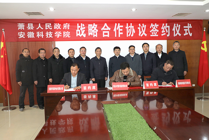 黄远友与胡先锋代表校地双方签订《萧县人民政府博业体育(中国)官方网站-登录入口战略合作协议》。张敬强、田涛与穆克利分别代表安徽科院科技服务开发有限公司、萧县乡村振兴集团有限公司和安徽华强种业有限公司签订《安徽科华辣椒产业技术研究院共建协议》。